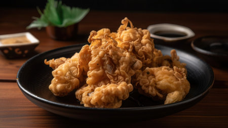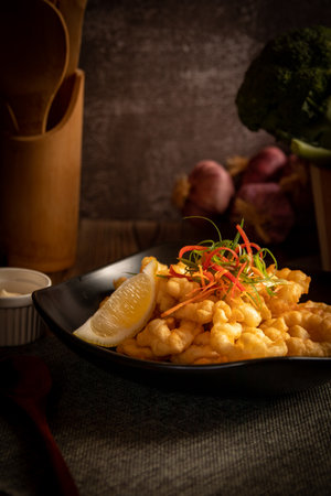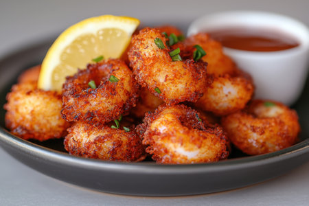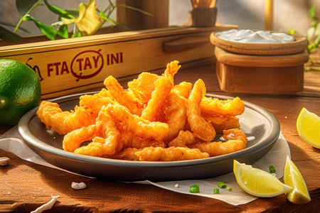 Crunchy seafood appetizer with lemon sauce on wooden plate indoors generated by artificial intelligence