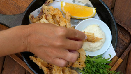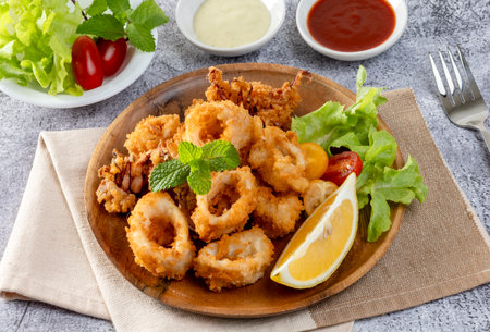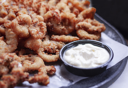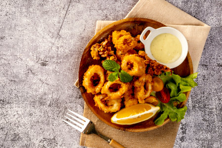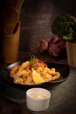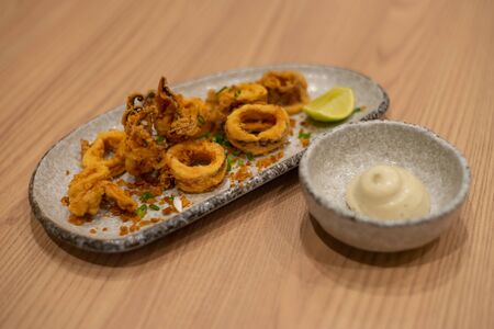 Caramari , Appetizer Crispy fried squid ring with tartar sauce on wood background traditional italian food