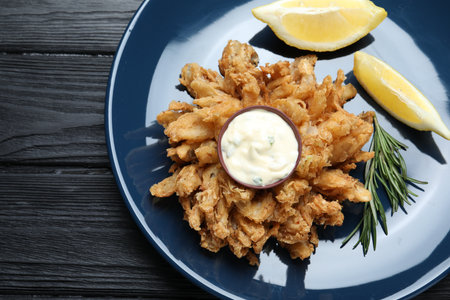 Fried blooming onion with dipping sauce served on dark wooden table, top view