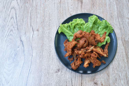 fried crispy salty chicken rib on plate eat couple fresh lettuce vegetable salad