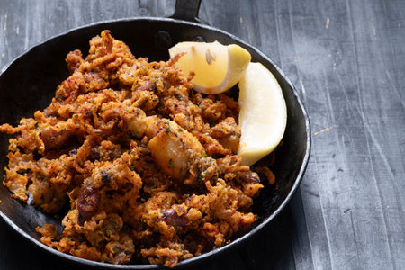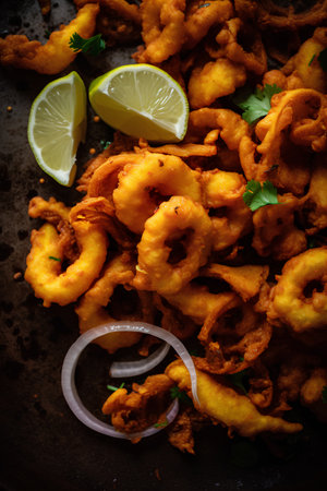 Crispy Calamari or pakora/pakoda or pattice also known as fried onion rings, served with lime and onion. Selective focus