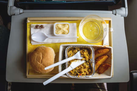 Portion of food for one passenger at airplane board. Indian dish on a folding table on Board the airliner Food served in the plane in economy class. The food in the plane of the top view.