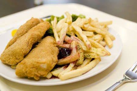 fried chicken and potato .fried chicken and french fries . Chicken Tenders with French Fries and Dipping Sauce . chicken nuggets and fried potatoes on a white plate