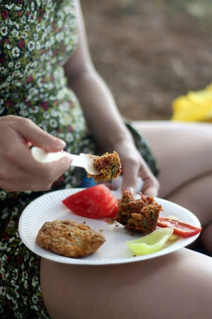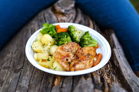 Unrecognizable person eating fried meat, homemade bread and fresh vegetables from paper plate. Outdoor picnic. Selective focus.
