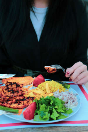 Woman hands eating minced meat cutlets with mashed potatoes on white plate in a cafe