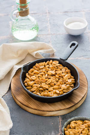 Fresh roasted peanuts in a frying pan, salt and oil on the table. Plant source of protein. Vegetarian food. vertical view
