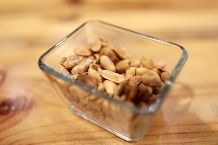 Roasted peanuts in glass cup on table