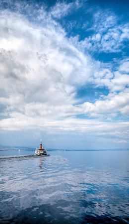 Cruising ship on Lake Constance, Bodensee near Meersburg in Germany. Text space in the upper area