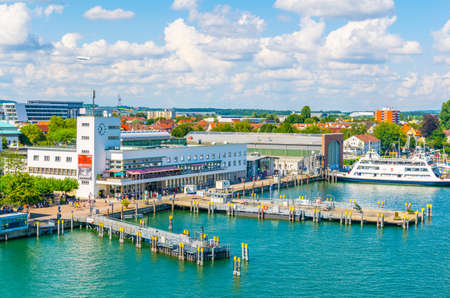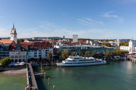 FRIEDRICHSHAVEN, GERMANY - SEPTEMBER 6, 2025: View of the Friedrichshafen harbor and old town from the observation tower on Lake Constance, Germany