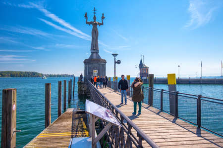 CONSTANCE, SWITZERLAND - April 2016 - Imperia statue in harbor of Konstanz city with a view to lake Constance. Konstanz is a city located in the south-west corner of Germany on borders with Switzerland.