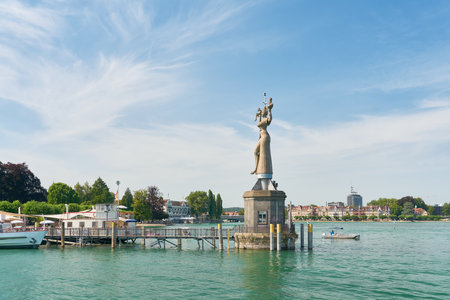 Constance, Germany - July 30, 2019: Old lighthouse and big statue of Imperia in harbor of Konstanz, Germany. Imperia is a landmark of the city. Panoramic view of Constance Lake (Bodensee) in summer.