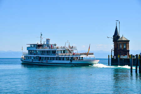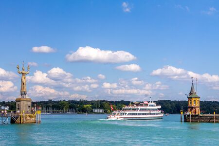 The city Constance on the Lake Constace, Bodensee. The view on the ship in the port with big statue and lighthouse. The city lies in Germany and Switzerland. There is blue clear crystal water. There is sunny day.
