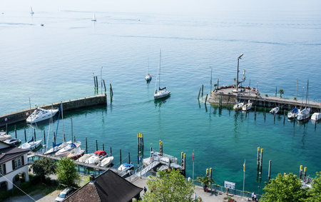MEERSBURG, GERMANY - JUNE 19: Sailing boat at the harbor of Meersburg, Germany on June 19, 2014. The historic town has over a million visitors each year. Foto taken from Neues Schloss.