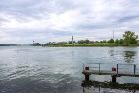 Kiel Canal entrance from the Baltic Sea with cloudy sky, small pier and signal tower in the distance