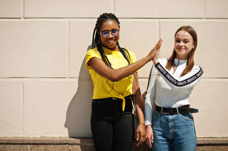 White caucasian girl and black African American together gives high five. World unity, racial love, understanding in tolerance.