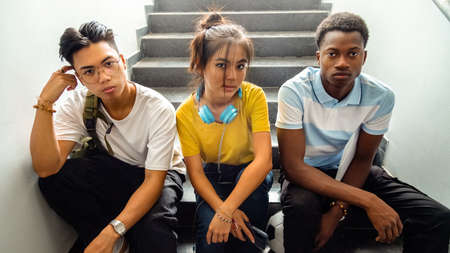 Portrait of multiracial group of teen high school students sitting on stairs looking at camera. Horizontal banner image. Back to school concept.