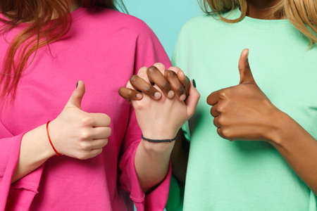 Close up shot of handshake between two international women friends european, african american, hold hands, showing thumbs up isolated on blue background. People lifestyle concept. Mock up copy space