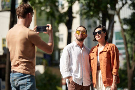 Close up of hands of young guy holding smartphone while taking photo of his girlfriend outdoors
