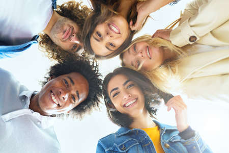 Multi-ethnic group of friends with their heads together in a circle.