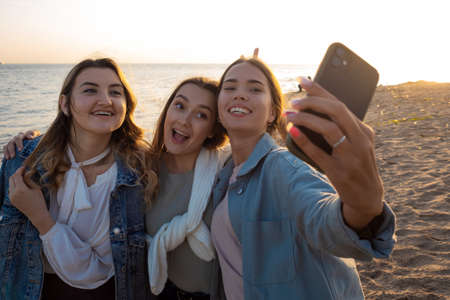 Three friends are walking on the beach, the happiness of communication.