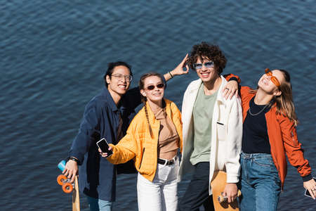 Young diverse friends having great time together. Group portrait of happy Caucasian, Afro American and Asian people standing in warm evening sunlight, hugging each other, looking at camera and smiling