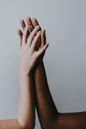 Hands of Caucasian and African young women with white and dark skin