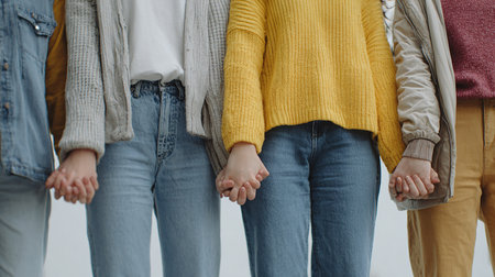 Cropped image of women holding hands in casual clothes against white background