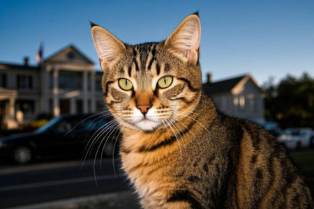 Curious tabby cat, with striking green eyes, stares up at camera from cobblestone street.