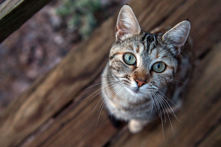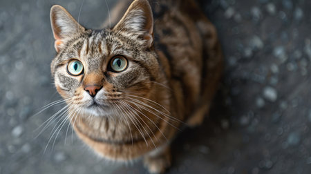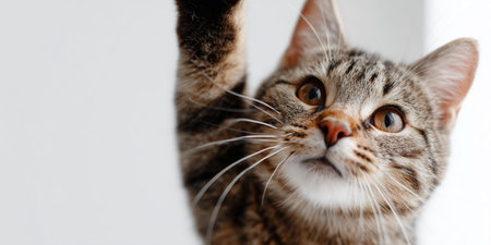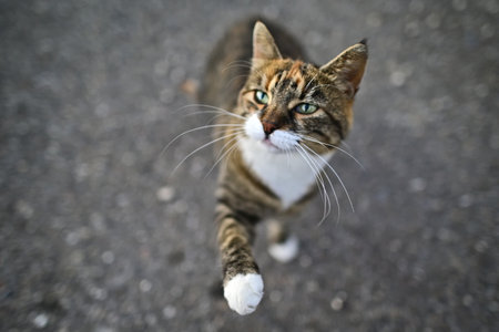 Funny tabby cat raises its paw. High angle view with selective focus.
