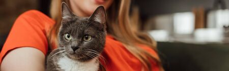 Adult serious brown cat with green eyes looking at the camera. Banner panorama. Free space for text