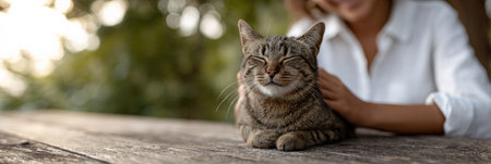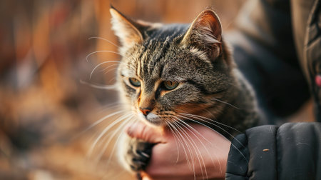 Close-up of a cat being petted, enjoying the moment. A tabby feline pet is shown with its eyes closed, enjoying the gentle touch of a human hand, creating a moment of peace, love and affection.