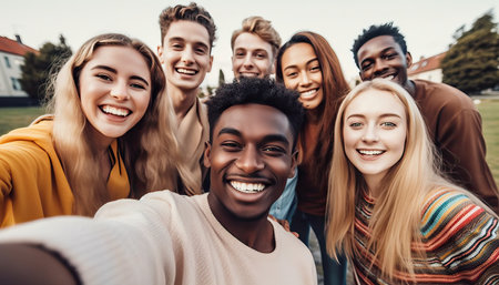 Global smiles: capturing joy in group selfies of cheerful and happy young people diverse nationalities, celebrating unity, friendship, cultural harmony in shared moments of happiness and togetherness
