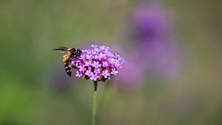 A large earth bumblebee (Bombus terrestris) feeding on a pretty verbena (Verbena bonariensis), green background