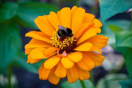 Bumblebee sits on an orange flower in garden. close-up. selective focus.