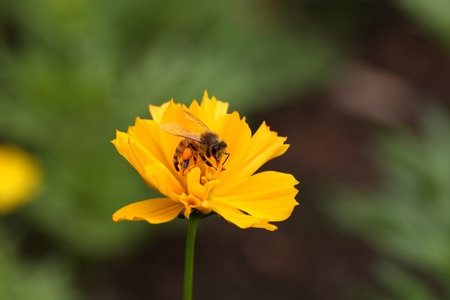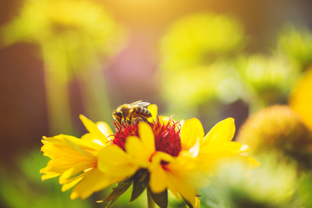 A bee is pollinating a bright and colorful yellow flower in a vibrant garden setting