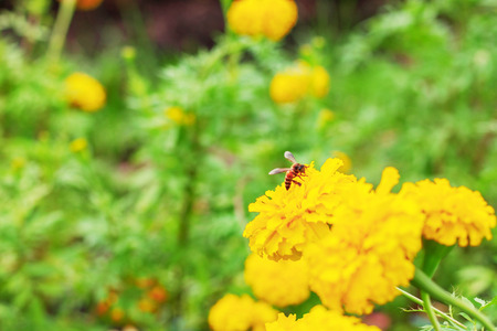 Close up shot of vibrant orange and yellow marigold flowers in full bloom with one or more bees actively collecting nectar from the flower s nectaries