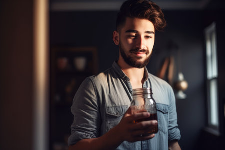 Young man in casual shirt examining money in glass savings jar by window with thoughtful expression about personal financial goals.