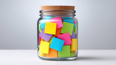 This image features a clear glass jar filled with vibrant sticky notes of various colors, capped with a cork lid. It presents an appealing organizational solution for creative workspaces.