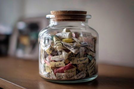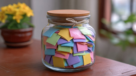 A clear glass jar is filled to the brim with colorful, folded notes, each one a preserved memory, a fleeting idea, or a secret wish.