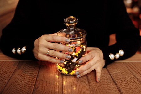 A young woman is sitting at a table in the dark with a jar full of candies.