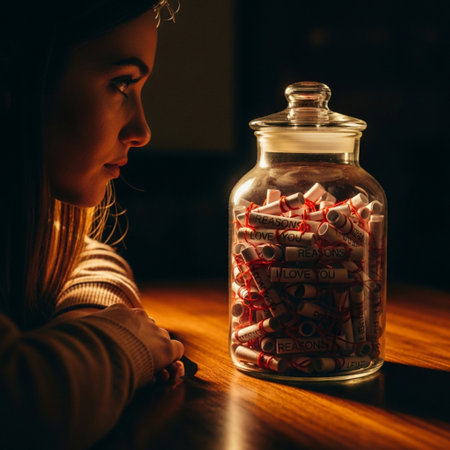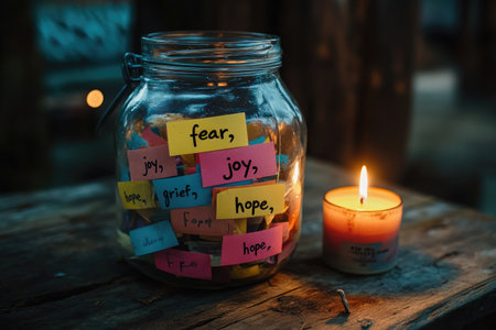 Glass jar contains vibrant notes labeled with emotions like fear, joy, and hope, placed next to a softly glowing candle on a rustic wooden table, creating a warm and reflective atmosphere