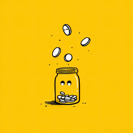 An illustration depicts a jar with coins falling inside, set against a solid yellow background. The artwork features simple lines and shapes, suggesting a flat style. This image could be used for various commercial projects related to finance, savings, or investments, providing a clean and easily adaptable design.