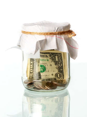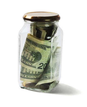 US Dollars Bills and Coins in Glass Jar Lying on White Background
