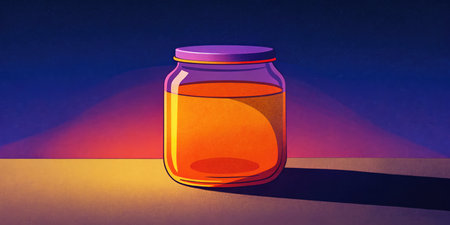 canola jar with shadow on wooden table, featuring a glassy translucence. this high-resolution image captures the object-oriented design, with a touch of webcore and smilecore aesthetics. the sparse and simple composition is enhanced by the sabattier filter, creating a visually striking and unique photograph. ai generated