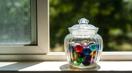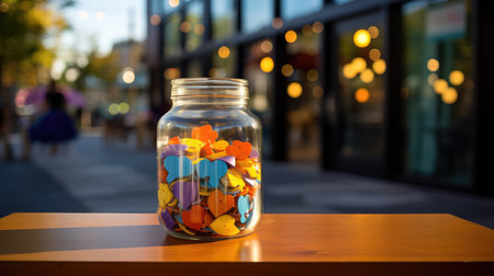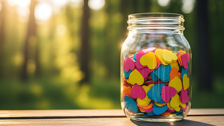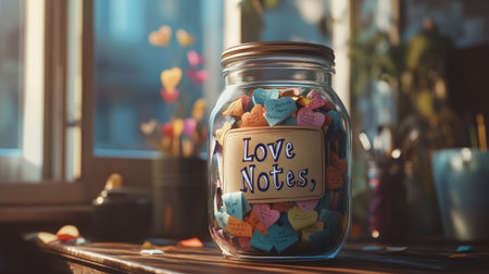 A beautifully crafted jar filled with colorful love notes in heart shapes, basking in warm sunlight. Perfect for expressing affection and cherishing memories.