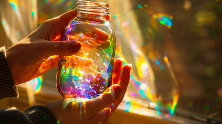 Uplifting digital artwork featuring luminous sunlight diffusion and vibrant multicolored harmony to evoke joy and motivation. Ideal for gratitude journaling projects, wellness planners, social media inspiration reels, vision board templates, or stationery branding aimed at self-care enthusiasts and content creators. Precise rendering of translucent glass effects and ... AI-generated illustration.