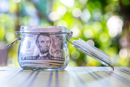 Saving money in a glass jar with us dollar banknotes and coins, suggesting financial planning and investment for future goals