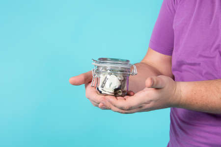man holding big glass jar with money banknotes on hand. finance power and stability concept. moderate consumption and economy
