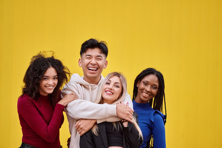 Multiracial young group of diverse friends standing together outside