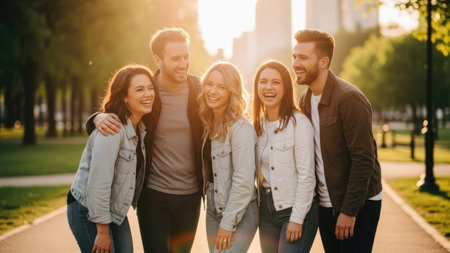 A group of friends stands together, laughing and embracing outdoors. The scene is bathed in warm sunlight, creating a cheerful atmosphere. The composition includes people, apparel, and park elements. This image is suitable for various commercial uses, including advertising and editorial content.